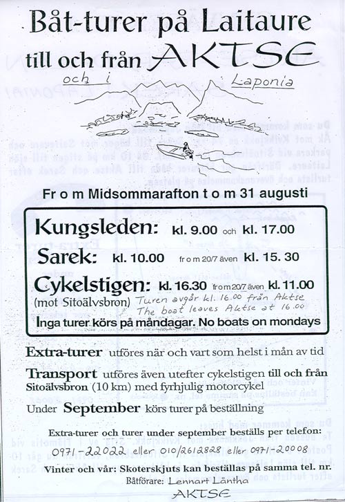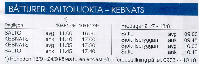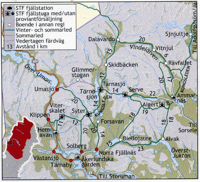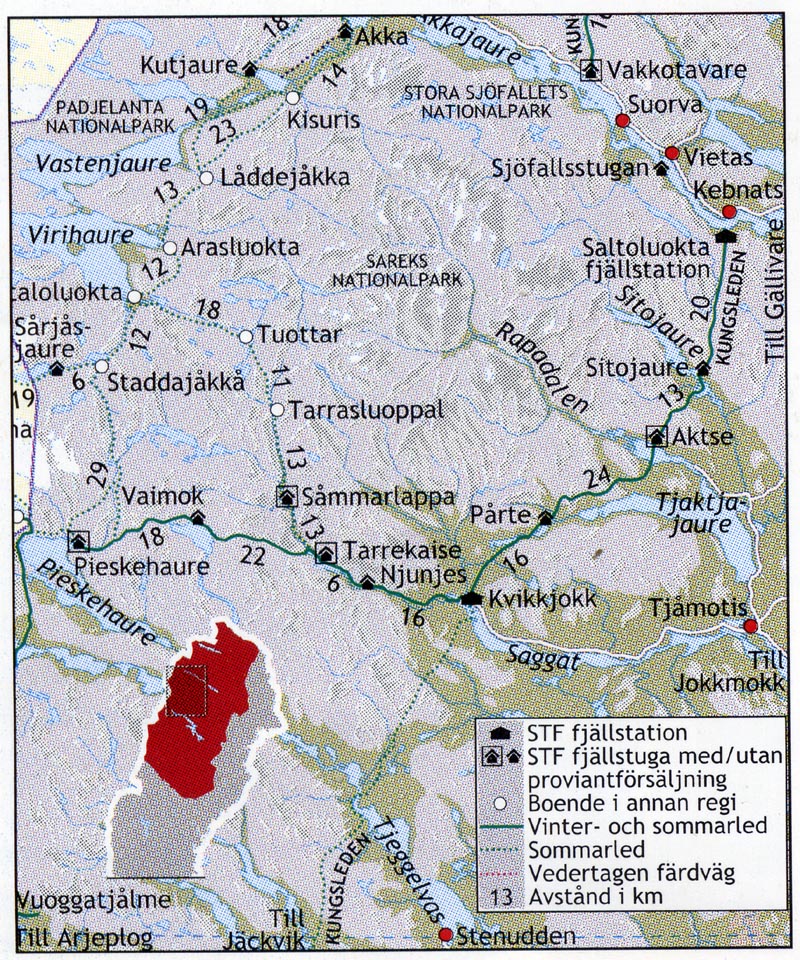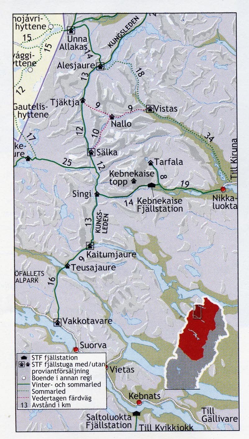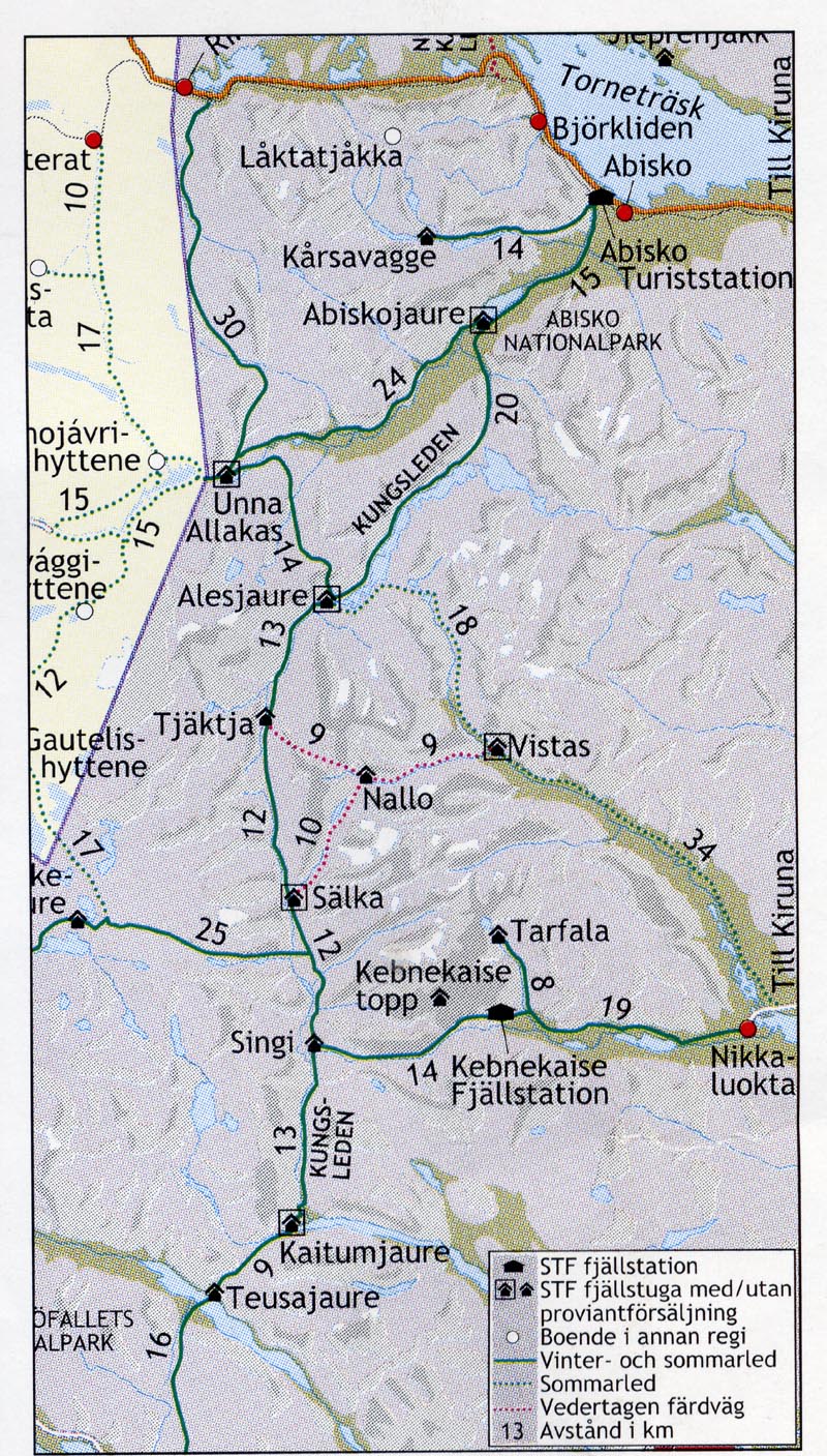 - Lengte : 52 km, daarna moet je een bus nemen van Vakkotavare naar Kebnatsbryggan / Saltoluokta, tussen Kebnats en Saltoluokta is er een overzet, in de winter ski je gewoon over het ijs, in Teusajaure is er ook een overzet of kun je een roeiboot nemen (maar de roeiboten worden door STF weggenomen na 20 september), 3-5 dagen
