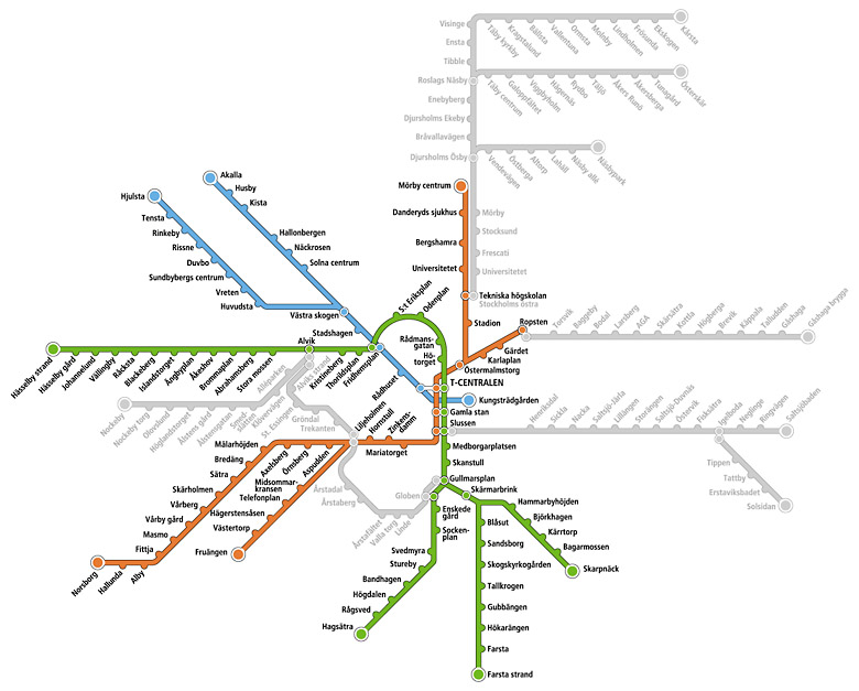 stadstransport : met de metro bereik je heel vlot de meeste plaatsen. Klik hier voor een kaart van het metro plan van Stockholm. Ze is echter heel duur als je losse ticketjes koopt. Voor enkele ticketjes ben je naargelang de afstand tussen de 25 en 40 SK kwijt voor een ritje, daarom is het sterk aan te raden voor 110 SK een rittenkaart te kopen waarmee je ongeveer 5-7 ritjes (met bus of metro) kunt doen. Als je wat langer blijft (bijvoorbeeld een week) denk ik dat het interessanter is een maandabonnement te kopen (600 SK, dit is ook het risico dat je loopt als je zonder kaartje betrapt wordt in de metro, veel Stockholmse jongeren kruipen over de toegangsdraaimolentjes) waarmee je onbeperkt bus en metro mag gebruiken, alsook een aantal bootverbindingen. Het bus -en metronetwerk strekt zich immers heel ver uit (je kunt makkelijk een stadsbus nemen die je 50 kilometer ver brengt naar bvb Vaxholm of Nynashamn) zodat je ook je daguitstappen met je abonnement kunt doen. Reken zelf uit wat voor jou het voordeligst is. Klik hier voor de ticket prijzen van de metro (Tunnelbana) in Stockholm. Het voornaamste stadsbusstation is Slussen. Parkeren met de wagen in het centrum van Stockholm is duur : 12 SK per uur voor straatparking (op sommige plaatsen controle tot 22u); ondergrondse parkings soms nog duurder. Elke straat heeft een wekelijkse kuisdag waarop parkeren verboden is. De enige oplossing is je wagen in de buitenwijken parkeren en met de metro naar het stadscentrum reizen.
